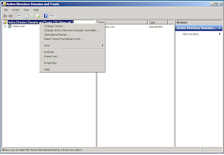 จากนั้นให้ท่านผู้อ่านทำการเปิดเครื่องมือที่ชื่อว่า Active Directory Domains and Trusts แล้วคลิ๊กขวาที่ Active Directory Domains and Trusts แล้วเลือก Raise Forest Functional Level ดังรูปครับ